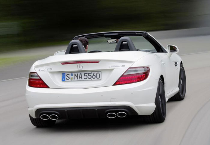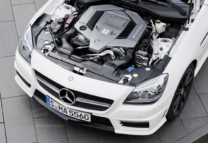 Μετά την πετρελαιοκίνητη έκδοση των 2,1 λίτρων και 204 ίππων, η γκάμα ολοκληρώνεται με την ταχύτερη έκδοση της νέας SLK, που φυσικά χρησιμοποιεί τον κωδικό AMG. Η έκδοση χρησιμοποιεί τον κινητήρα χωρητικότητας 5,5 λίτρων και διάταξης V8 που αποδίδει 422 ίππους.Πιο συγκεκριμένα, η δυνατότερη SLK στην ιστορία του μοντέλου φορά τον εκπληκτικό ατμοσφαιρικό V8 των 5,5 λίτρων (5.461 κ.εκ.) που αποδίδει 422 ίππους στις 6.800 σ.α.λ. και 540 Nm ροπής στις 5.400 σ.α.λ. Το αυτοκίνητο θέλει μόλις 4,6 δλ. για τα 0-100 χ.α.ω. με την τελική ταχύτητα να περιορίζεται ηλεκτρονικά στα 250 χ.α.ω. ενώ η μέση κατανάλωση είναι τα 8,4 λίτρα/100 χιλιόμετρα με τους ρύπους CO2 να κυμαίνονται στα 195 γρ./χιλιόμετρο.